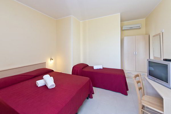 L’hotel dispone di 103 camere suddivise in camere doppie, triple o quadruple con terrazzino o balcone, tutte dotate di servizi privati, asciugacapelli, aria condizionata, TV, telefono, cassetta di sicurezza e minifrigo (consumazioni a pagamento).